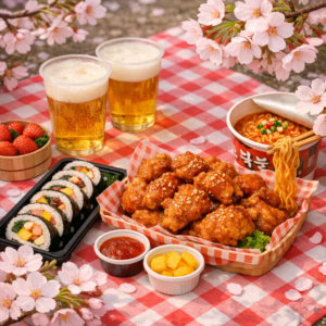 한국 피크닉은 치킨·맥주 중심의 ‘먹방’ 문화이다. 한강 윤중로, 석촌호수 일대에서 벚꽃을 보며 즐기는 음식은 치킨과 맥주의 조합이 필수다. 배달의민족·쿠팡이츠 등 배달 앱에서 벚꽃 시즌 주문이 폭증하며, 현장에서 간편하게 구매할 수 있는 편의점 도시락, 떡볶이, 김밥도 인기다. 따뜻한 날씨에 차가운 맥주와 뜨거운 치킨의 조화가 한국식 봄나들이의 정수인 셈이다.