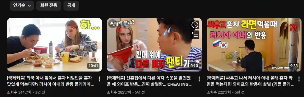 | 외국 아내 앞에서 혼자 비빔밥을 맛있게 먹는다면? 러시아 아내의 반응 몰래카메라 | 조회수 344만회. 채널 1위 영상. 비빔밥을 혼자 맛있게 먹는 장면을 연출해 아내 나스타의 반응을 담은 대표 몰래카메라 콘텐츠. |